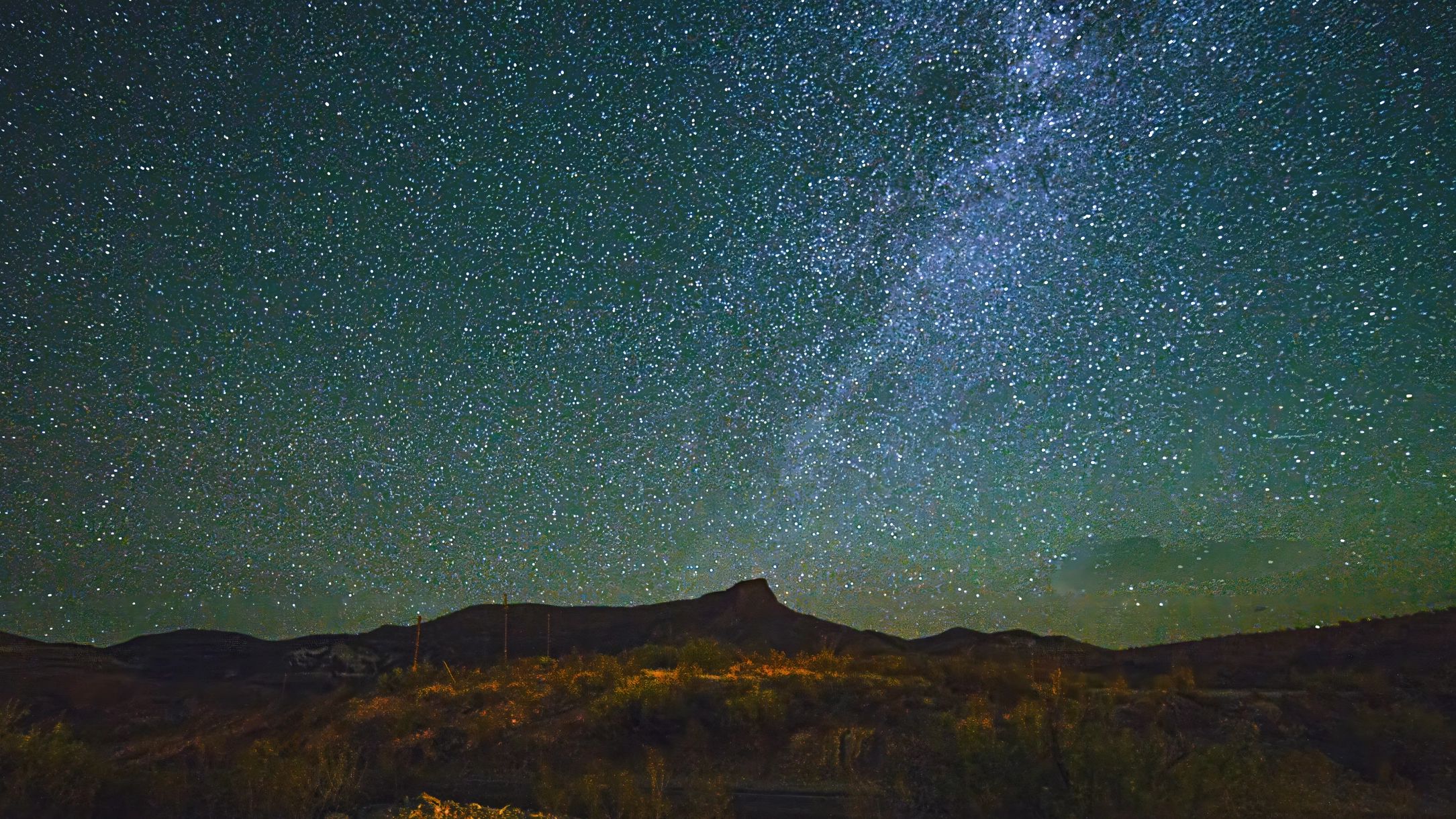Composite of 200 star images, stacked to make trails, with single car headlights in lower frame